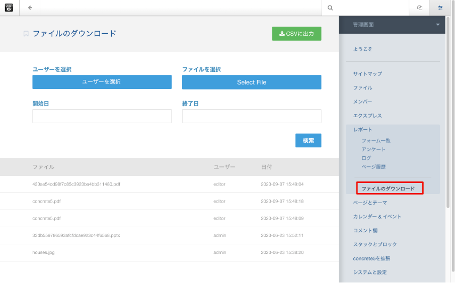 設定が完了すると、ログインユーザーがアップロードしたファイルのダウンロード履歴が表示されます。