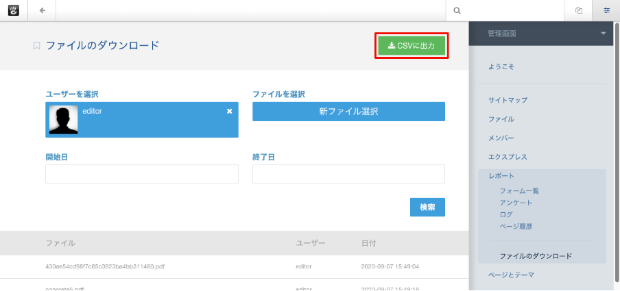 また、管理画面からファイルやユーザー単位でダウンロード履歴を検索することが可能です。