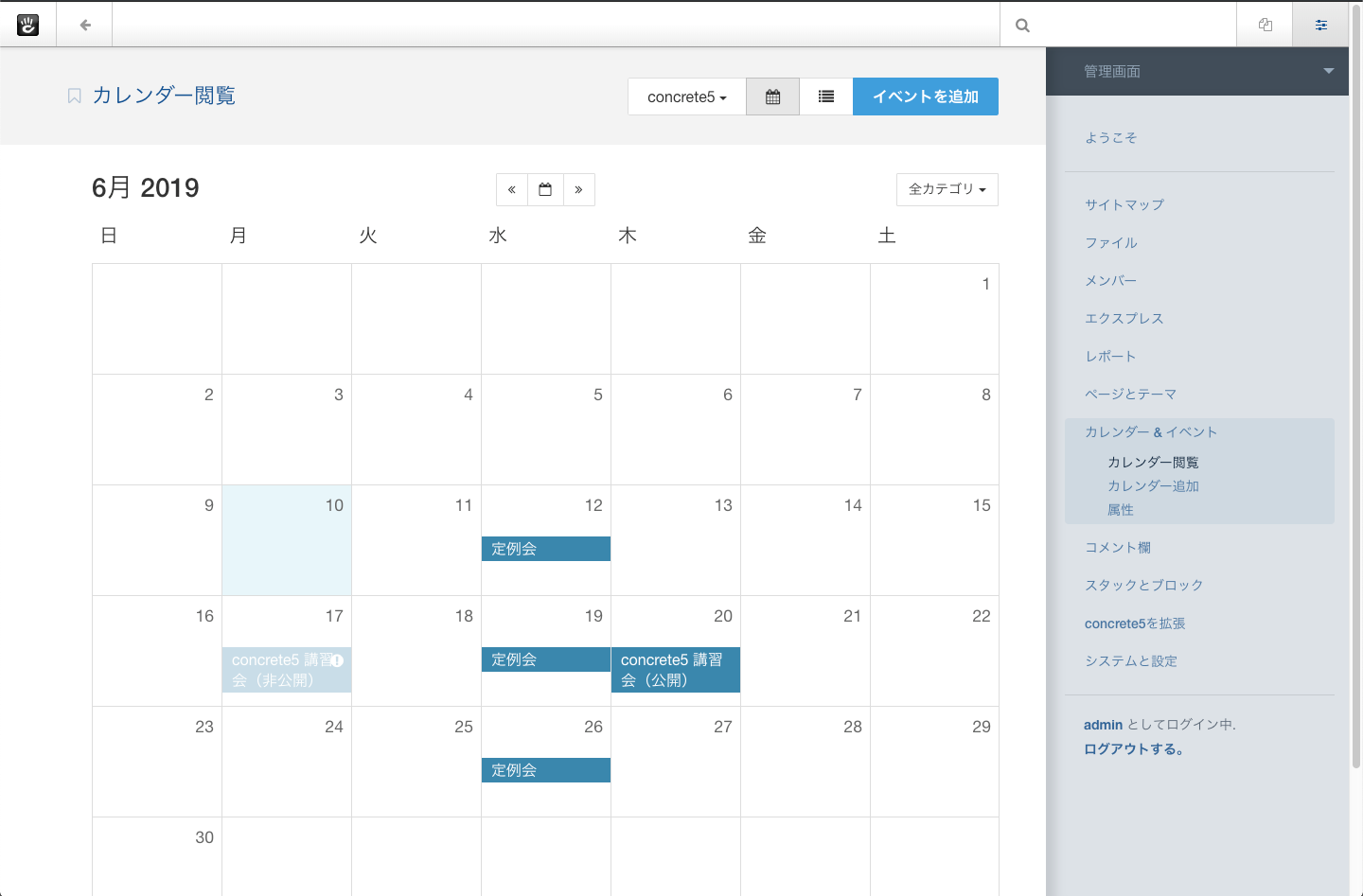 イベントの追加や削除操作を行うには、あらかじめカレンダーを作成している必要があります。 カレンダーの作成については上述の カレンダーを管理 を参照ください。