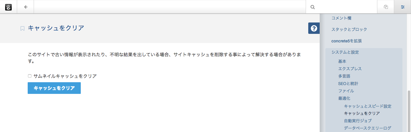 管理画面>システムと設定>最適化>キャッシュをクリア を開きます。(管理画面が表示できない場合は、ツールバーの検索窓より検索してみてください。それでもページが見つからない場合は管理者へ依頼してください)