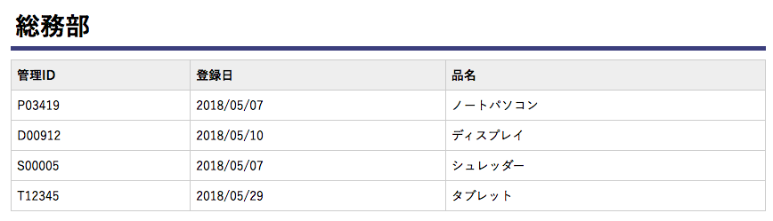 備品の品名・ID番号・登録日を管理すると同時に、その備品をどの部署で使用しているかを管理するデータベースを作成することができます。