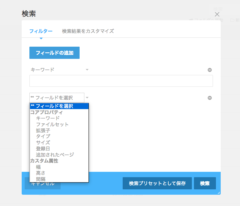 2.「フィールドの追加」をクリックして、フィールドを選択します。 ファイルセット、拡張子、登録日、追加されたページなど、様々な条件で絞り込むことができます。