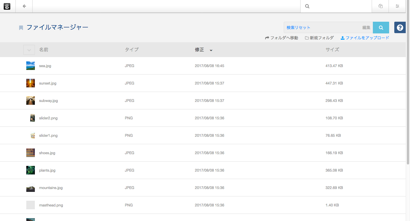 1.ファイルマネージャーを開き、右上の「ファイルのアップロード」をクリックします。