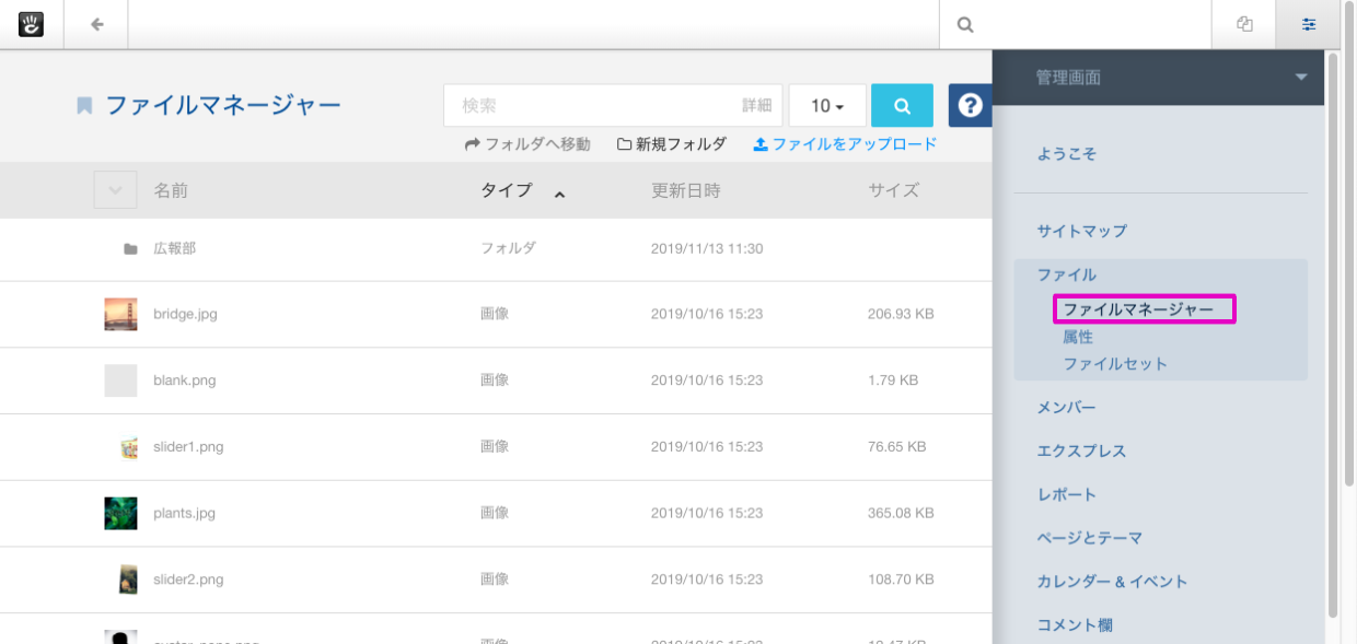 画像ファイルや、PDFファイルの追加・アップロード、設定変更などはファイルマネージャーを使用します。